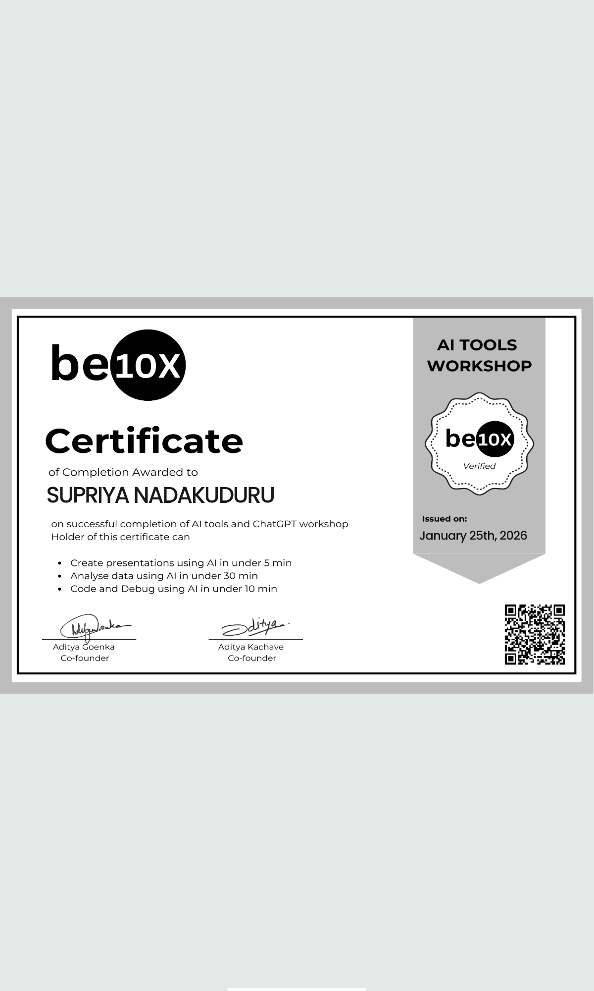 Completed a hands-on workshop on AI tools and their real-world applications, focusing on how artificial intelligence can improve productivity, automation, and problem-solving. During the workshop, I learned how to use modern AI tools for: Content creation and automation Improving workflow efficiency Understanding prompt engineering basics Exploring real-world use cases of AI in industries This experience helped me gain practical exposure to AI technologies and how they can be applied in daily tasks and professional work environments.